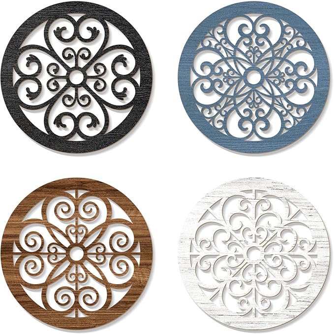 • You Will Receive: A total of 4 round wood kitchen decor in the package. Our wood wall decor uses vivid hollow flower patterns and 4 different but complementary designs, which can add a charming retro atmosphere to your home space.