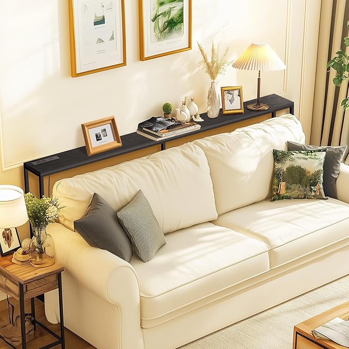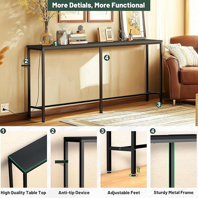 70 Inch Console Table with Outlet, Sofa Table with Charge Station Long Entryway Table for Office, Hallway, Bedroom, Living Room(Charcoal Black)