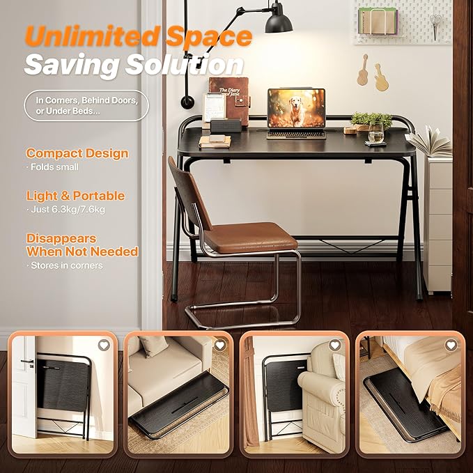 • 【Sturdy & Durable Build】Strong steel frame, adjustable feet, and cross-leg design of the portable folding desk provide exceptional stability. The water-resistant, scratch-resistant tabletop blends seamlessly with any home decor — perfect for bedrooms, apartments, RVs, offices, and more
