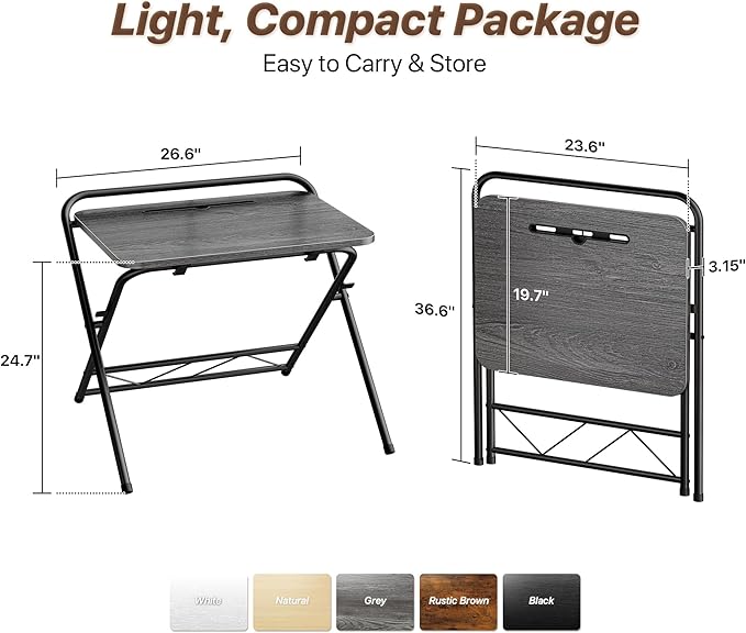 • 【Compact, Foldable & Space-Saving】Perfect for small spaces! Fold Size: 3.15'' X 26.6''X 36.6''. This lightweight foldable computer desk tucks neatly under beds, behind sofas, against walls, or in closets, small dorm. When you need more room, simply fold this office desk up and store it away. Ideal for maximizing your space