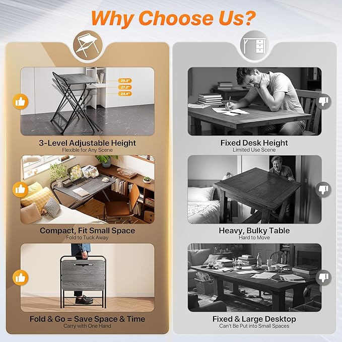 • 【Sturdy & Durable Build】Strong steel frame, adjustable feet, and cross-leg design of the portable folding desk provide exceptional stability. The water-resistant, scratch-resistant tabletop blends seamlessly with any home decor — perfect for bedrooms, apartments, RVs, offices, and more