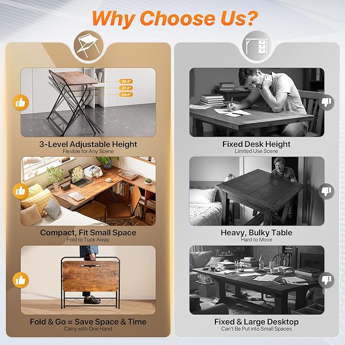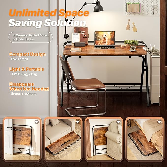 • 【Sturdy & Durable Build】Strong steel frame, adjustable feet, and cross-leg design of the portable folding desk provide exceptional stability. The water-resistant, scratch-resistant tabletop blends seamlessly with any home decor — perfect for bedrooms, apartments, RVs, offices, and more