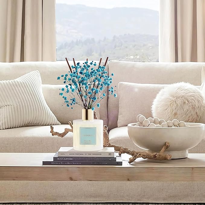 • Includes: One fragrance diffuser glass bottle, 6.7 fl oz mixture of essential oils combined with fragrance, one pc. of real preserved baby's breath flowers, and 8 pure cotton sticks. Adjust the amount of aroma released by adding or removing the sticks.