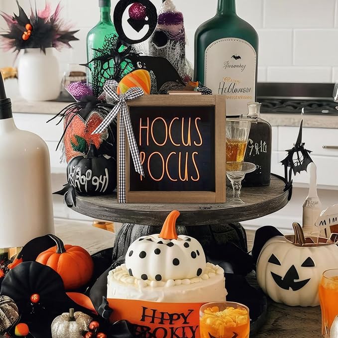 Hocus Pocus Sign, 6 Inch Wooden Halloween Decorative Signage Table Top Decor, Gothic Witch Indoor Tabletop Wall Art Shelf Mantel Desk Tiered Tray Rustic Farmhouse Home Decorations