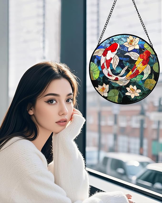 Stained Glass Window Hanging, Koi and Lotus Sun Catcher for Door Home Decor Fish Suncatcher Christmas Mother's Day Birthday Gifts for Women Men Mom and Nana 7.8 in