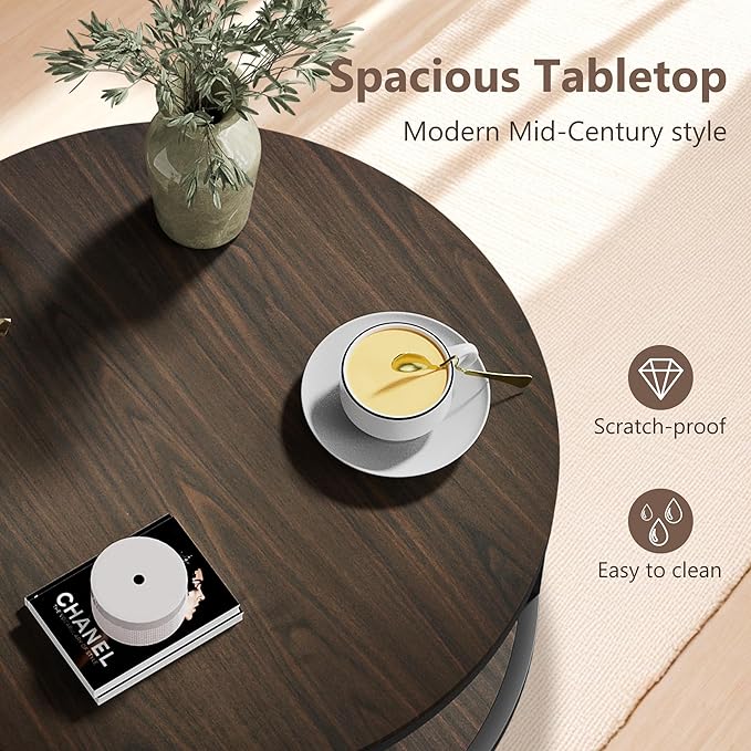 • [Sturdy Wood Coffee Table] The top of our round coffee table is made of MDF material which is Eco-friendly P2 particle board, waterproof and wear-resistant, Multi-step finish process achieves both good looks and superior durability. Thick matte alloy legs sturdy enough to support the coffee table.