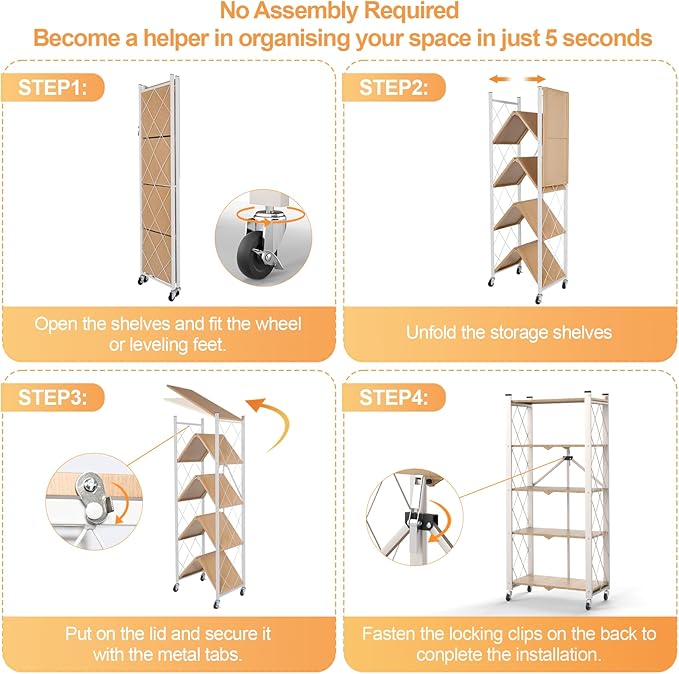 • EASY TO ASSEMBLE: The folding shelves simply open the frame and adjust the shelves on top. The whole process takes less than 30 seconds, no assembly and no tools required. When not in use, it can be folded, and when folded, it measures only 3.74 inches, so it can be placed in any corner. Can also be used as garage storage, rolling bookshelf, kitchen storage, commercial shelving, etc. Perfect for storing kitchen utensils, books, files, tools, sales items, crafts and unused clutter.