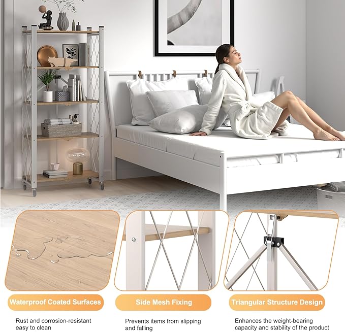 5-Tier Foldable Storage Shelves with Wheels, Folding Metal Shelf Unit, Folding Bookshelf no Assembly, Collapsible Shelves for Craft Shows for Kitchen, Bedroom, Living Room, Natural