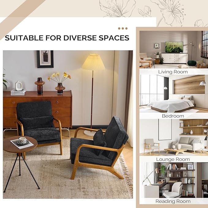 VINGLI Chenille Mid-Century Modern Accent Chair, Cute Reading Arm Chair with Cushion & Lumbar Pillow & Solid Wood Frame for Lounge, Living Room, Reading Room, Bedroom, Black