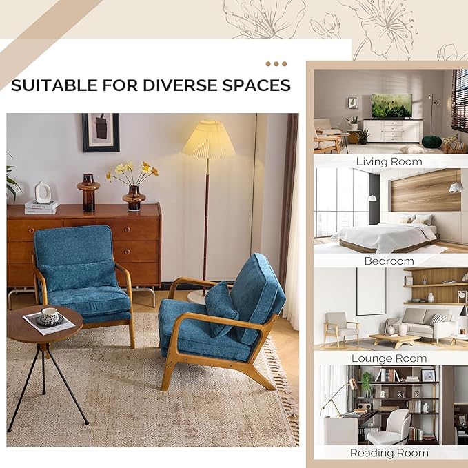 VINGLI Chenille Mid-Century Modern Accent Chair, Cute Reading Arm Chair with Cushion & Lumbar Pillow & Solid Wood Frame for Lounge, Living Room, Reading Room, Bedroom, Blue