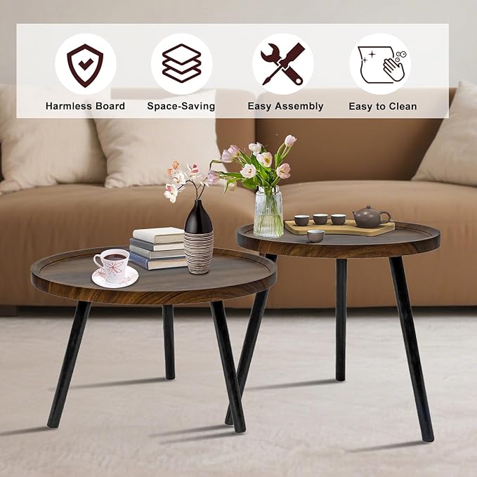 Jessie 2 Pcs Small Round Coffee Tables,Mid Century Modern Nesting Tables,Easy Assembly Circle Walnut Coffee Tables with Non-Slip Feet,Wood Grain Top Nesting Coffee Table for Living Room Balcony Yard