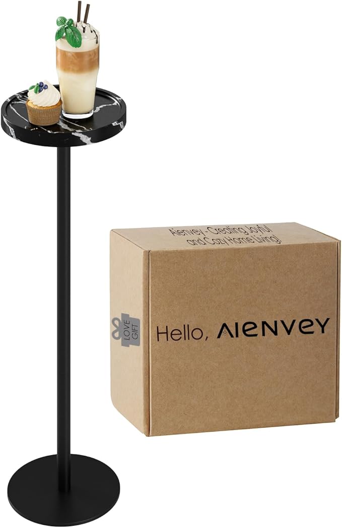 Drink Table, Small Pedestal Side Table, Round Cocktail Table, Circle Accent End Table with Metal Base, for Small Spaces (1, Black Marble)