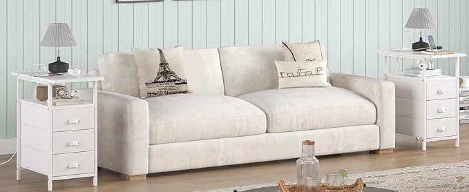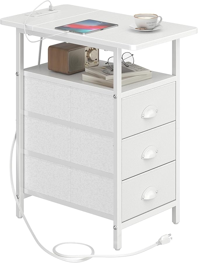 End Table with Charging Station, Side Tables Livingroom with USB Ports and Outlets,Narrow Nightstands Bedside Tables with 3 Drawers PU Finish for Small Space,Slim Sofa Table Bedroom,White