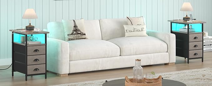 • End Table with 3 Drawers : Sthmec side tables designed with quality material and 3 storage drawers.Side Table bedroom with particle board & robust metal frame & storage basket. 2-Tier shelf with 3 Fabric storage drawers,1st and 2nd top open shelf to place your belongs and 3 tier drawers with large capacity to collect books clothes and toys.