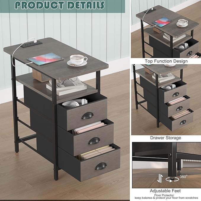 End Table with Charging Station,LED Side Tables with USB Ports and Outlets,Narrow Nightstands Bedside Tables with 3 Drawers for Small Space,Slim Sofa Table for Livingroom,Grey