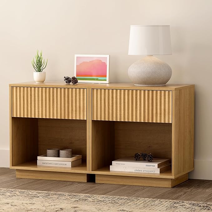Fluted End Table with Drawer Set of 2, Modern Wooden Nightstand Bed Side Table with Storage Shelf Bedside Night Stand for Bedroom Living Room Sofa, Natural Oak