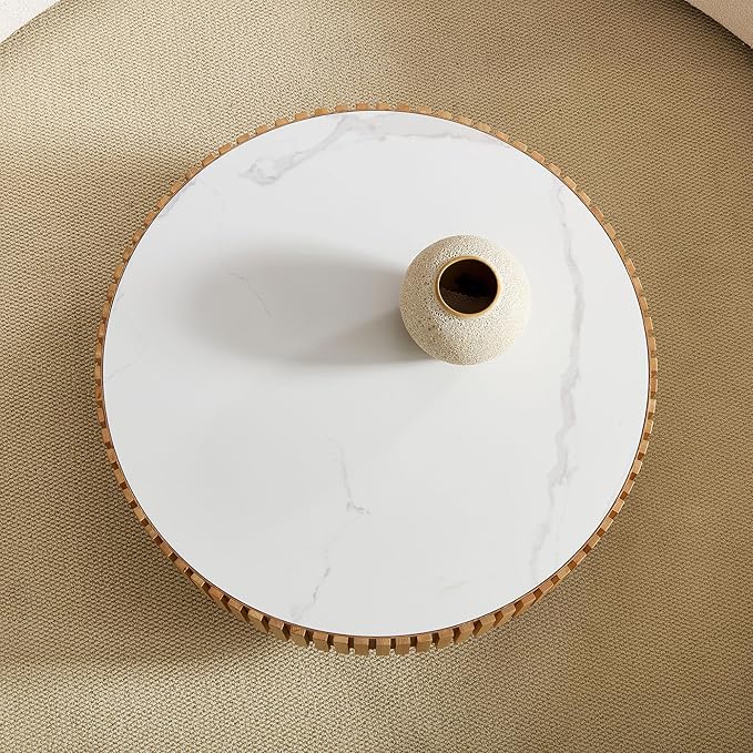 35.43" Round Coffee Table,Modern Handcraft Relief Drum Circle Wood Side End Accent Center for Living Room, Apartment, Oak