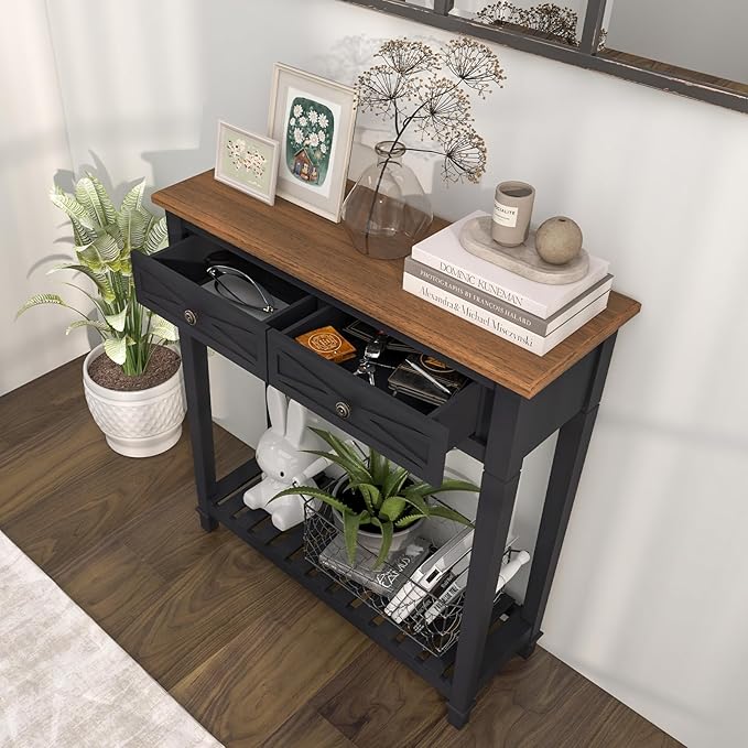 Kinsuite Narrow Console Table with 2 Drawers & Storage, 2-Tier Farmhouse Wooden Entryway Tables, Sofa Table Hallway Table for Living Room Hallway, Black