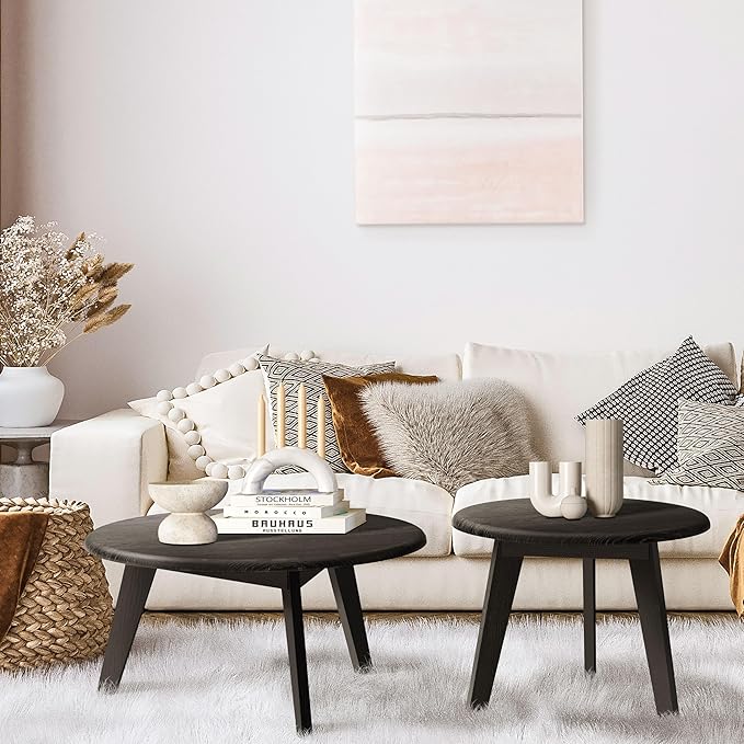 • ELEGANT & FUNCTIONAL AESTHETIC - With its vintage-inspired look, these round nesting tables combine graceful curves with simple lines, seamlessly blending a rustic charm with modern and industrial aesthetics. The matte black metal base and wood-patterned tabletop create a timeless appeal, while the solid wood veneer top adds a natural touch to your home.