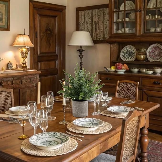 • 【Larger & Fuller】Our fake plant has been upgraded to a larger size,measuring 14" wide and 11.8" tall, pots measure 4" tall and 3.7" diameter. each artificial plants features realistic stems that create a full, vibrant look. This eucalyptus plant provide a fuller look, natural and real touch. Note:Those artificial plants are made of paper pulp, please don't put it in water.