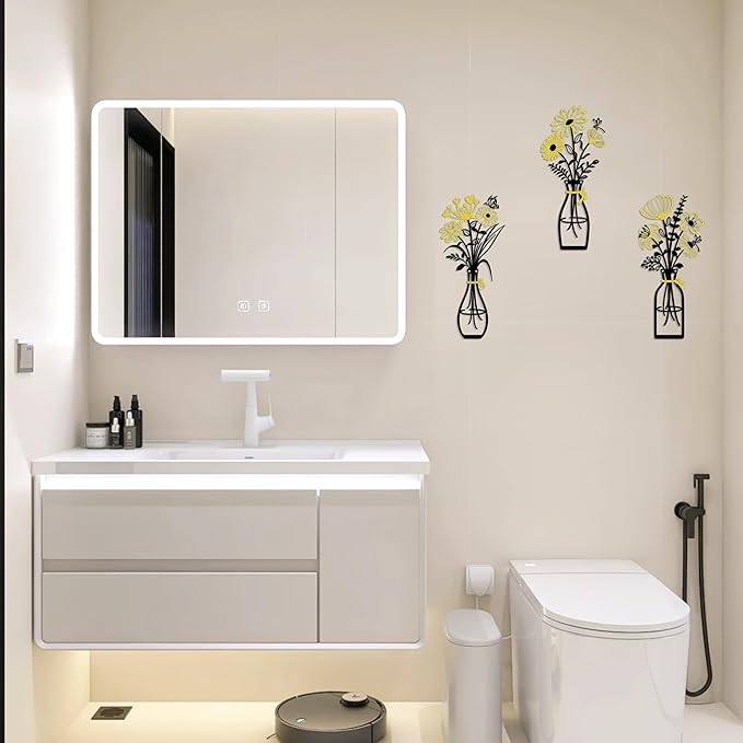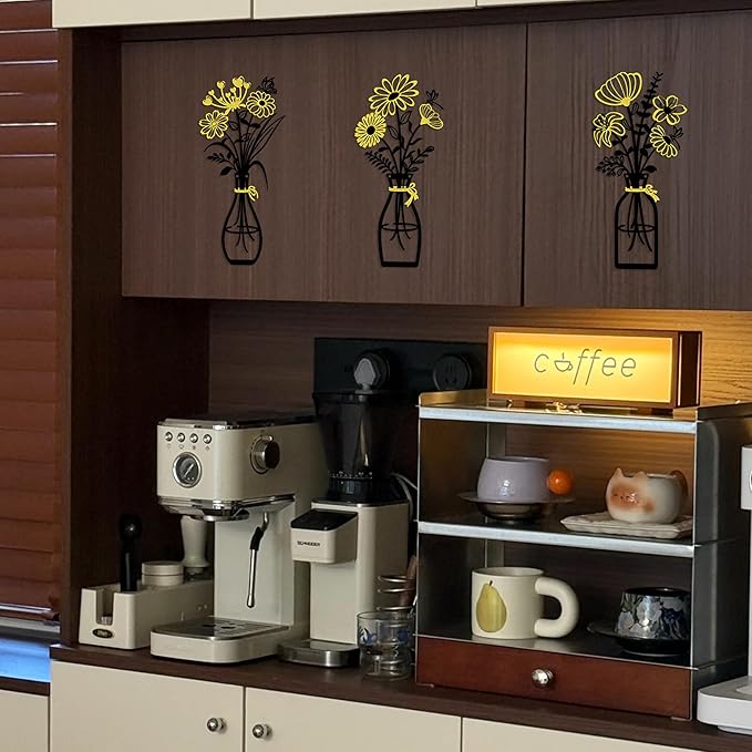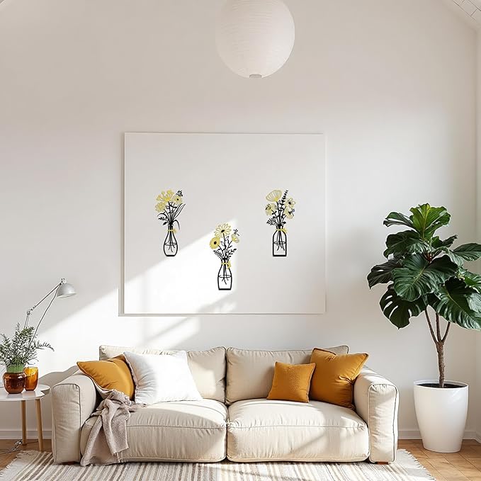 Iron Metal Vase Flower Wall Art Set of 3 - Minimalist Black Floral Decor for Living Room Bedroom Kitchen, Office Garden - Modern Farmhouse Home Decor & Housewarming Gifts (Black-Golden)
