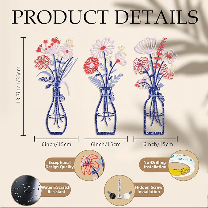 • DECORATIVE SET: Letter-Free Version, Create an elegant focal point with this three-piece set of metal wall art. Each piece measures 13.8" x 6.3" and features delicate floral silhouettes for a modern, wordless look.