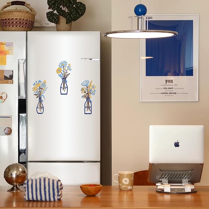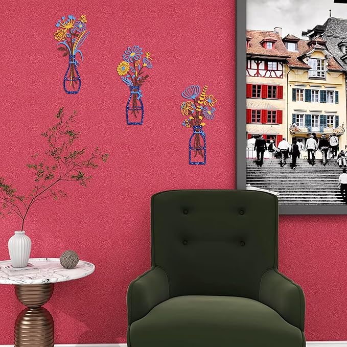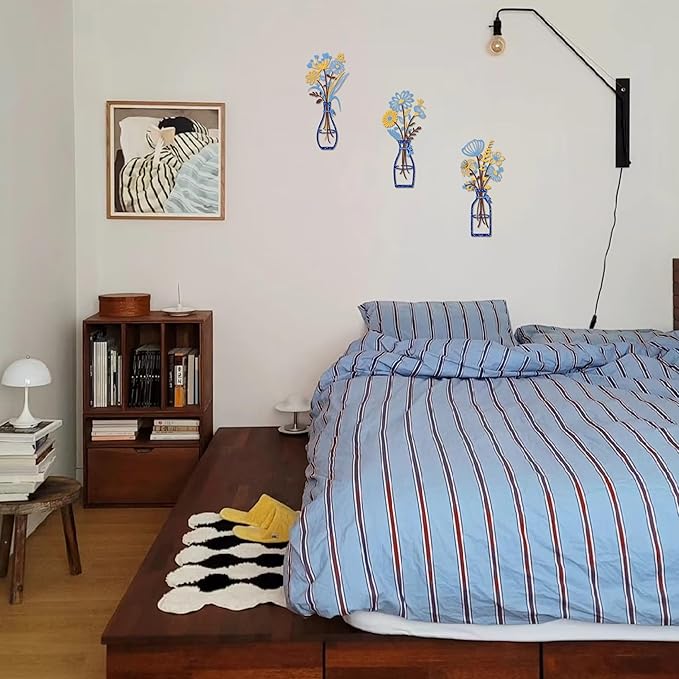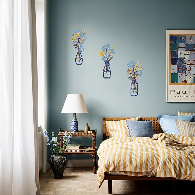 Iron Metal Vase Flower Wall Art Set of 3 - Minimalist Black Floral Decor for Living Room Bedroom Kitchen, Office Garden - Modern Farmhouse Home Decor & Housewarming Gifts (Blue-Yellow)