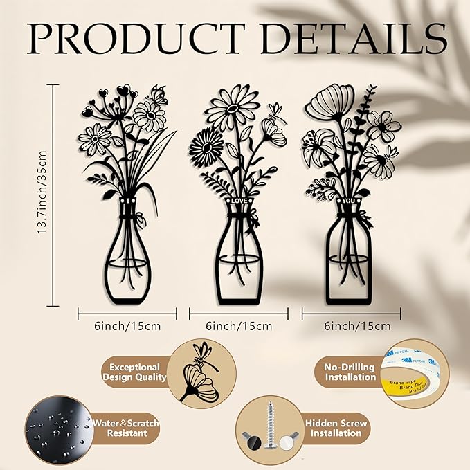 • Perfect for Any Room – RIJINDOUJIN 3-Piece Metal Flower Floral Vase Wall Art are designed for bedrooms, living rooms, hallways, kitchens, bathrooms, dining rooms, or workspaces.