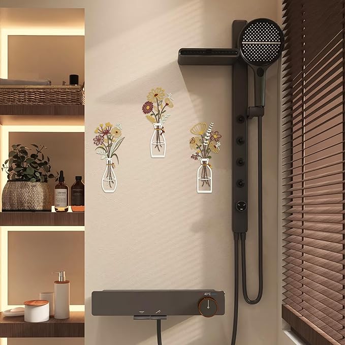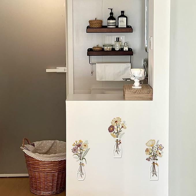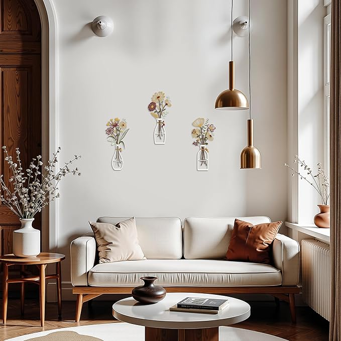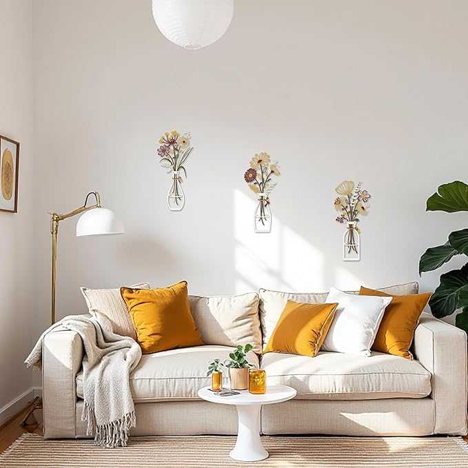 Iron Metal Vase Flower Wall Art Set of 3 - Minimalist Black Floral Decor for Living Room Bedroom Kitchen, Office Garden - Modern Farmhouse Home Decor & Housewarming Gifts (Yellow-Brown)