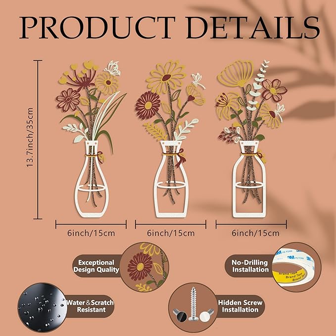 • DECORATIVE SET: Letter-Free Version, Create an elegant focal point with this three-piece set of metal wall art. Each piece measures 13.8" x 6.3" and features delicate floral silhouettes for a modern, wordless look.