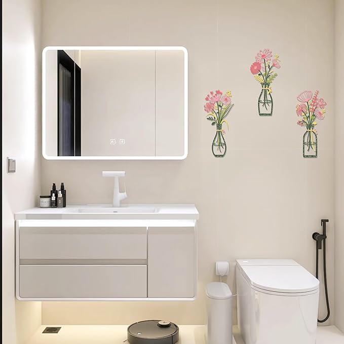 Iron Metal Vase Flower Wall Art Set of 3 - Minimalist Black Floral Decor for Living Room Bedroom Kitchen, Office Garden - Modern Farmhouse Home Decor & Housewarming Gifts (Green-Pink)