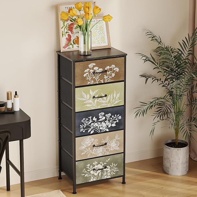 Tohomeor Vintage Dresser Vertical Nightstand with Neutral Botanical Plant Fabric Chest Drawers for Closet Bathroom Storage Tower Unit Bed Side Organizer Farmhouse Rustic (Multi, 5 Drawers)