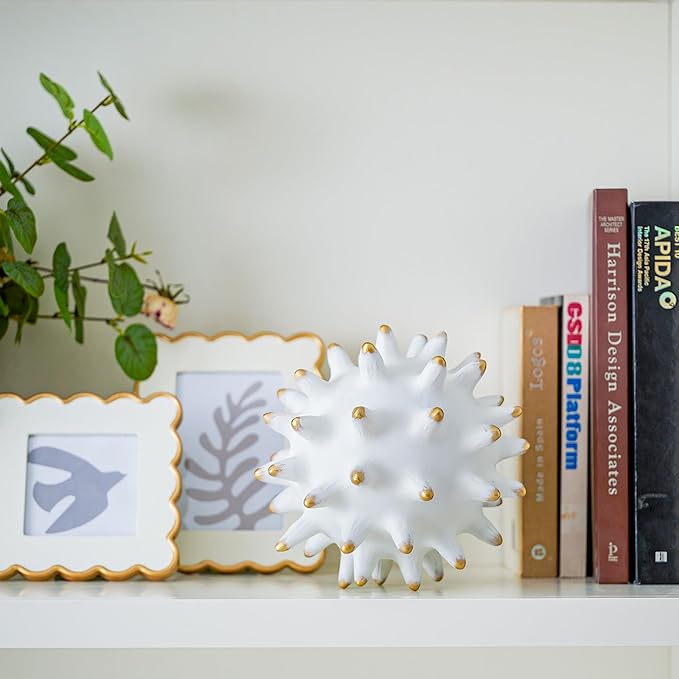 • [Striking Modern Design] This 7.9-inch resin decorative ball features bold white spikes with gleaming gold tips, creating a captivating contrast perfect for contemporary spaces. The sculptural piece adds instant artistic flair as shelf decor, coffee table centerpiece, or masculine office accent