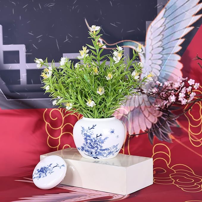 XINGYAN Chinese Traditional Blue and White Porcelain Ceramic Small Ginger Jar with Lid,for Tea Storage,Home Decorative,Home Decor Jar,Bud vase (Model-7)