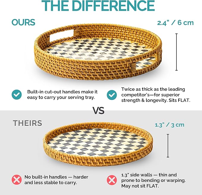 • ⭐️ PREMIUM MATERIALS & REFINED DETAILING: Our ~ 14-inch round trays are expertly woven from sturdy braided rattan and finished with a shimmering shell inlay design. The strong wooden base, subtle lacquer, and polished finish ensure exceptional durability, while maintaining the natural texture of the rattan.