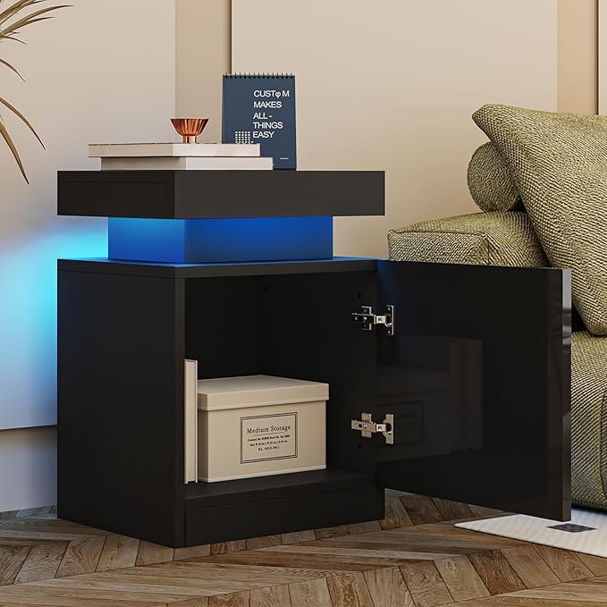 oneinmil LED Nightstands Set of 2, Night Stand with Storage Cabinet for Bedroom, Bedside Table with LED Lights, Modern End Side Table, Black