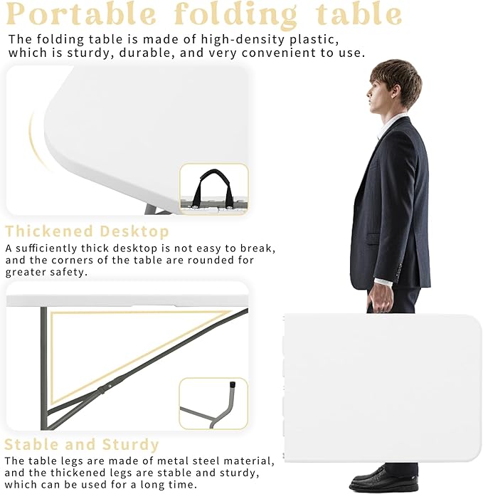 • Multi Functional Outdoor Table:The surface of this folding table is smooth and sturdy, easy to wipe, and the table corners are designed with rounded corners for safety and reliability. The anti slip covers on the four table legs prevent the table from shaking freely and protect the floor from scratches. Each table can accommodate 4-10 people, making it the best choice for outdoor camping, indoor activities, picnics, offices, birthday parties, banquets, weddings, craft fairs, kitchen table, and other events.