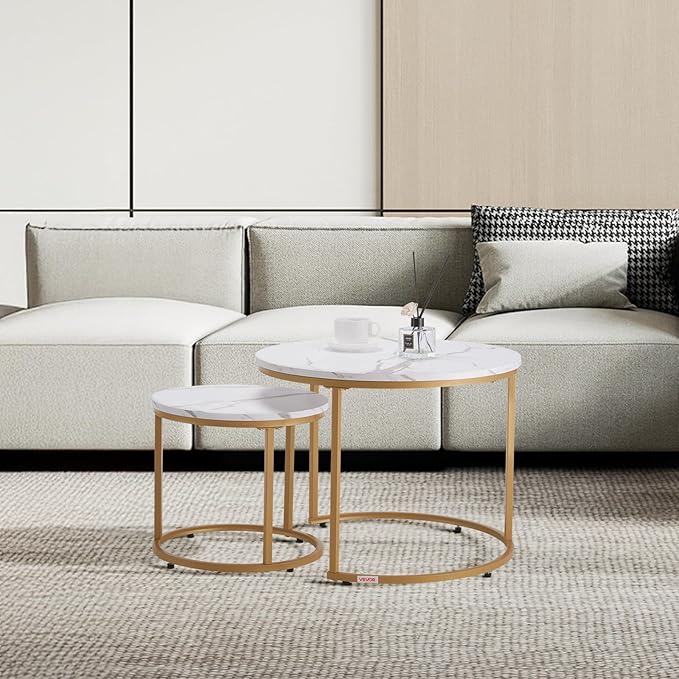 VEVOR Nesting Tables, Coffee Table Set of 2, 23.6 inch Round Coffee Table, Small Coffee Tables Night Stand with Metal Frame, for Living Room, Bedroom, Office (White & Gold)