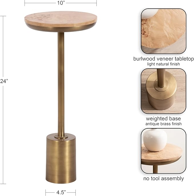 Kate and Laurel Xyler Modern Round Wood and Metal Drink Table, 10 x 10 x 24, Burlwood and Antique Brass, Transitional Pedestal Table for Use as Indoor Plant Stand or Living Room Decor Accent