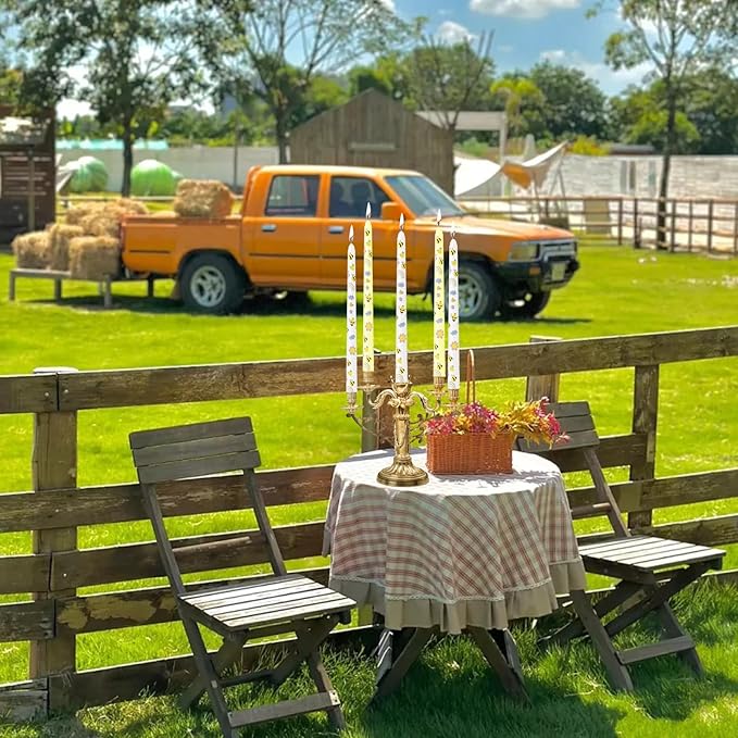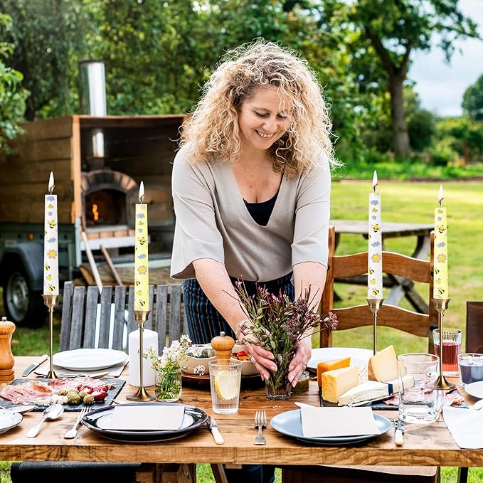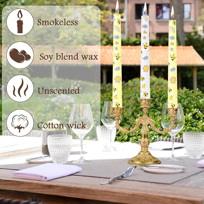 • 【Dripless Honeybee Taper Candles】: Enjoy a clean, elegant burn with our dripless design (trim wicks to 5mm for best results). The charming honeybee patterns add rustic charm to farmhouse tables, garden parties, and spring celebrations.