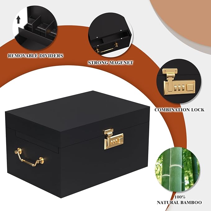 • 🧩 Customizable Interior Space: The removable tray and adjustable dividers let you personalize the layout of this large stash box. Whether it’s used as a wooden stash box for accessories or a functional bamboo box for tools, the flexible design adapts to your needs.