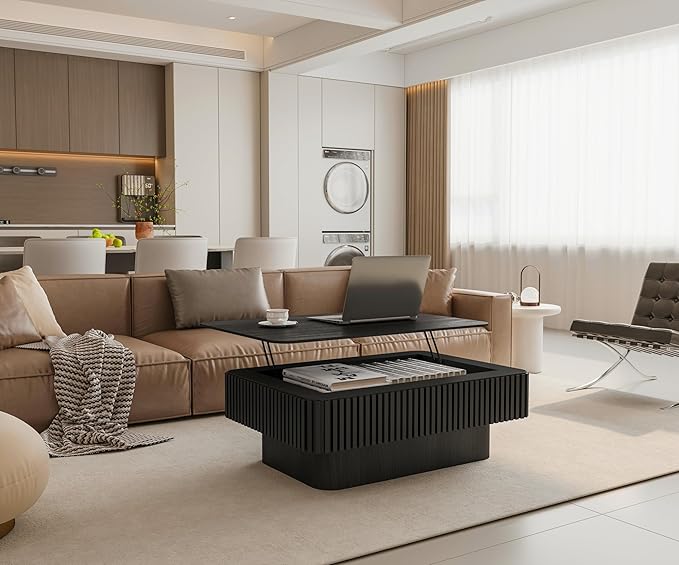 38.6'' Lift Top Fluted Coffee Table with Hidden Compartment, Modern Rectangular Wooden Center Table Cocktail Tea Table with Storage and Adjustable Height for Living Room Apartment, Black