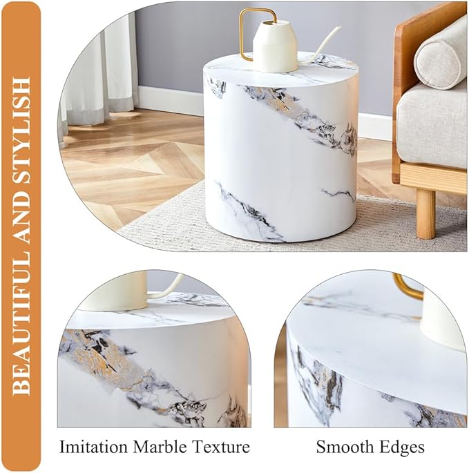 • Round Side Table End Table: Elevate your home decor with the high-quality faux marble grain tabletop that exudes a contemporary vibe. Making it an ideal addition next to a chair or sofa. The MDF frame provides essential stability and strength, ensuring a reliable surface for placing items without any wobbling. The foot pads prevents slips and protects your floor from scratches and can hold up to 100 Lbs