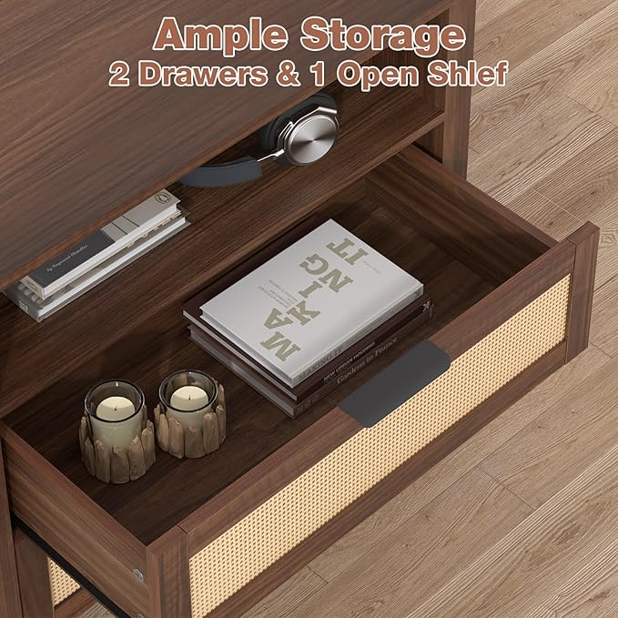 HOMMPA Nightstand with Charging Station, Boho Bedside Table with USB and Type-C Ports, Large Rattan Night Stand with 2 Drawers, Side Table End Table for Bedroom, Living Room, Small Space, Walnut