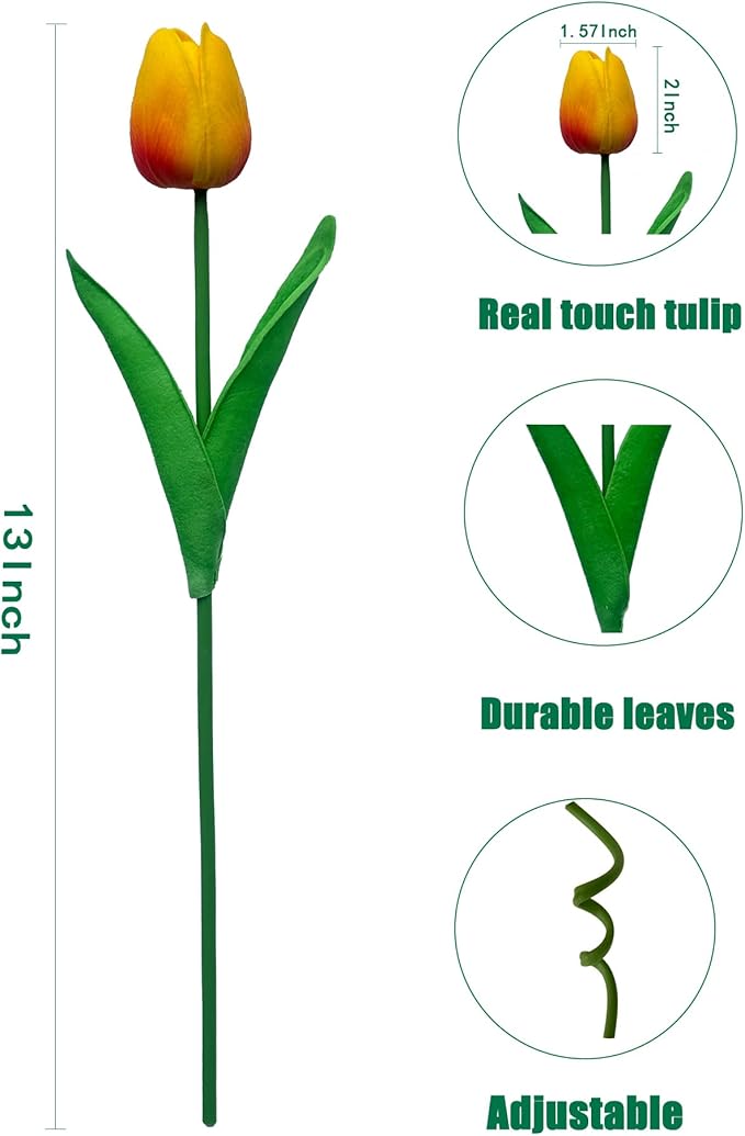 • MATERIAL: Our artificial tulips are made of plastic and polyurethane, which has a soft texture and a realistic touch. Inside the stem is durable wire that can be easily bent and cut to fit different vases as needed