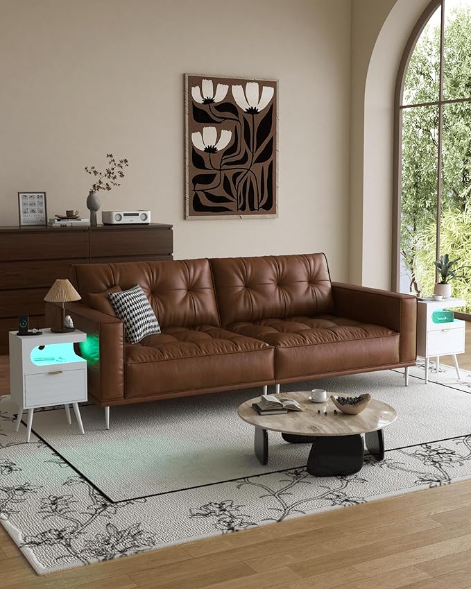White Nightstand with Charging Station and LED Lights,Modern Bedside Table with Storage Drawer,Night Stand with Solid Wood Legs,White (White-1)