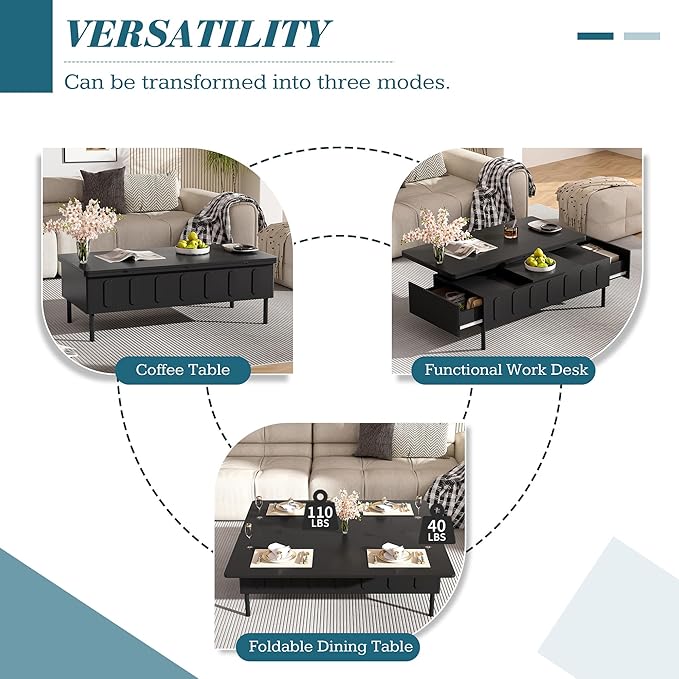 • Space-Saving Design: With a foldable top to maximize your space, this coffee table can double as a dining table for gatherings, giving you capacious table surface to set drinks, snacks and more.