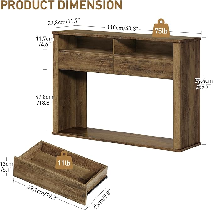 • Ample Storage Space: This farmhouse entryway table features a spacious tabletop, 2 semi-open compartments, and 2 large drawers for storing books, plants, and decorative items. The bottom shelf is ideal for shoes or storage boxes, keeping your living space tidy