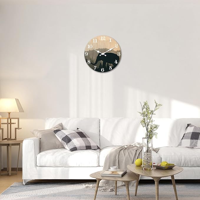 • 【EASY READ WALL CLOCK】The farmhouse elephant wall clock size is 12 inches. No solid wood,the wall clock is with MDF material.Made of MDF board(No real wood).Vivid color,farmhouse wall clock,clear to read,no glass cover,no bezel,practical and beautiful. Easy to read with black large Arabic numerals and hands, even from side.