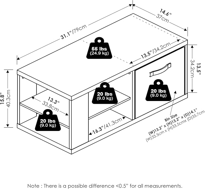 • WEIGHT CAPACITY: The tabletop of this coffee table/ side table supports up to 55 lbs and the lower shelf up to 20 lbs each, the open shelf with storage bin holds 20 lbs; Total support 115 lbs